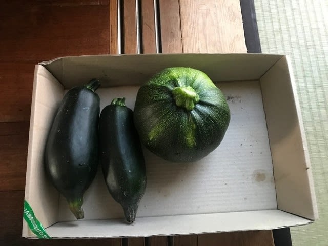 この畑で採れたズッキーニです。右の丸いのはカボチャではありません、これもズッキーニなのです。