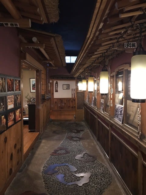 写真はライトアップされた「金具屋」さんの有名な外観と、アップダウンが大変な内部です。とても凝った造りですね。