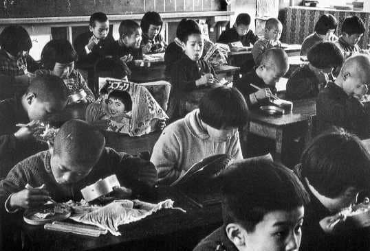 貧しくて弁当を持参できない子供は、周りの子供がお弁当を食べ終わるまで視線をそむけず、じっと本を読みます。